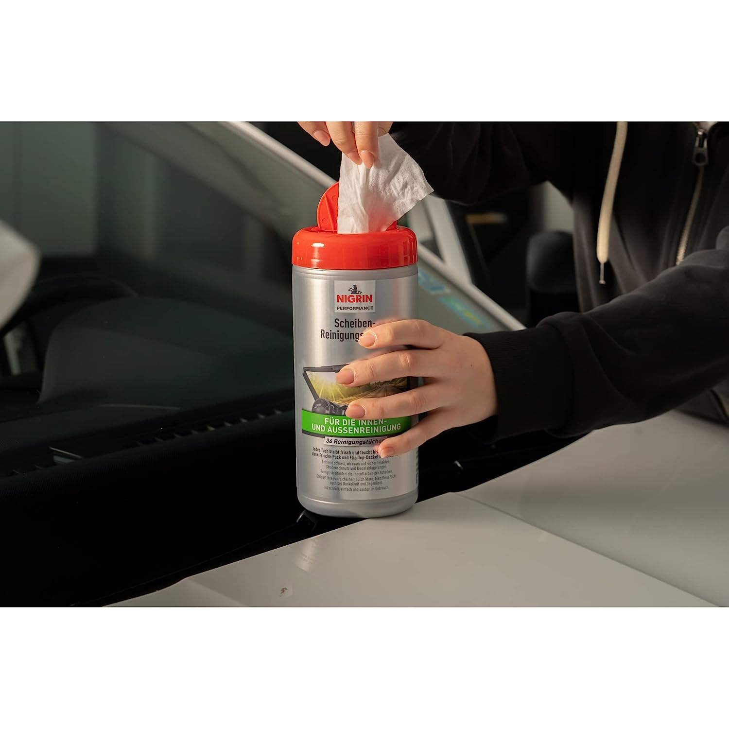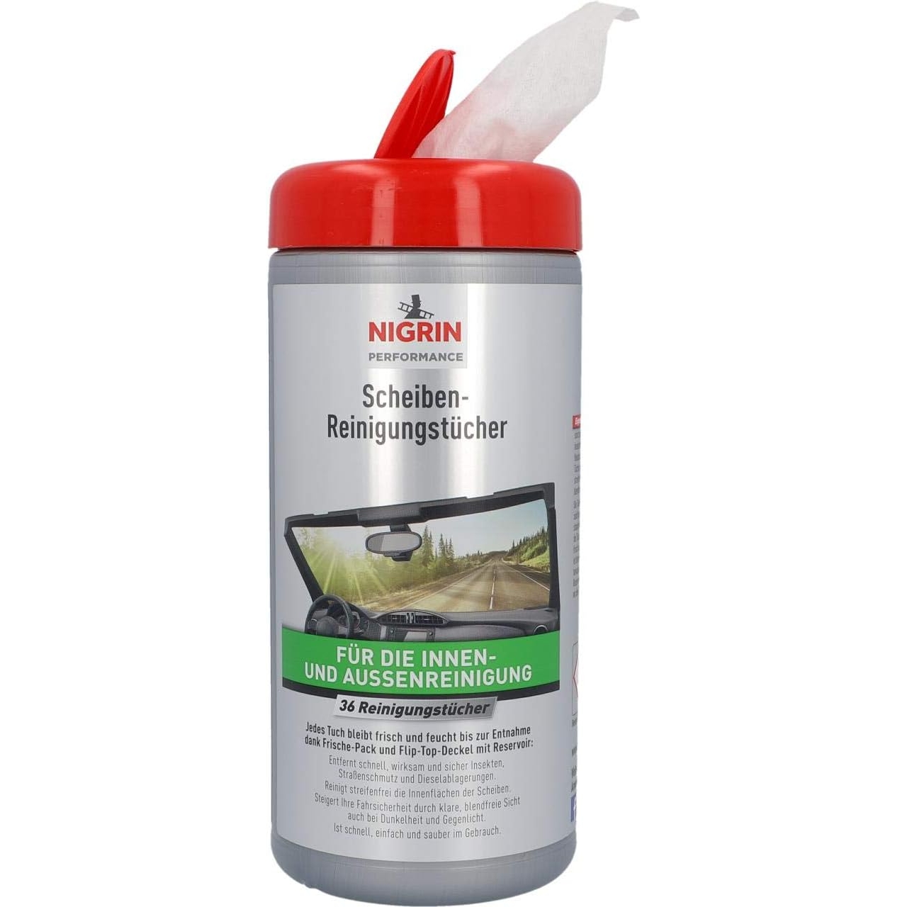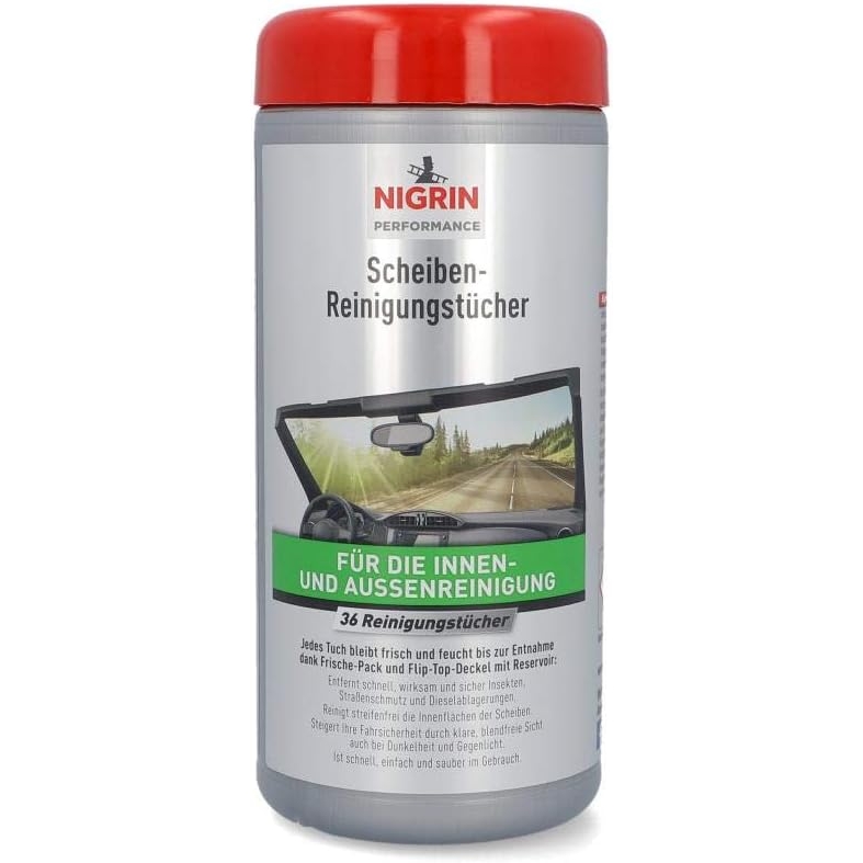 Mit den NIGRIN Autoscheiben Reinigungstüchern lassen sich Scheiben im Fahrzeug schnell und effektiv reinigen. Die Tücher sind für Innen- wie Außenseiten von Scheiben und für Scheinwerfer geeignet. Dort entfernen die NIGRIN Autoscheiben Reinigungstücher fettige Verschmierungen, Reste von Insekten, Straßenschmutz oder auch Verunreinigungen, die von Treibstoffen stammen. Über den Flip-Top-Deckel lässt sich bequem jederzeit ein Tuch entnehmen. So sind die Tücher immer gut geschützt und bleiben feucht.
