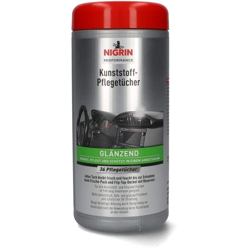 Die NIGRIN Kunststoff-Pflege-Tücher erneuern und pflegen das Aussehen der Kunststoff-, Gummi- und Vinyloberflächen im Fahrzeug-Innenraum und stellen die Griffigkeit wieder her. Die Pflege-Tücher sind mit einer Lotion durchtränkt, die farbauffrischend und antistatisch sowie schmutz- und wasserabweisend wirkt. Die NIGRIN Kunststoff-Reinigungstücher verleihen den Oberflächen ein hochglänzendes Finish.
