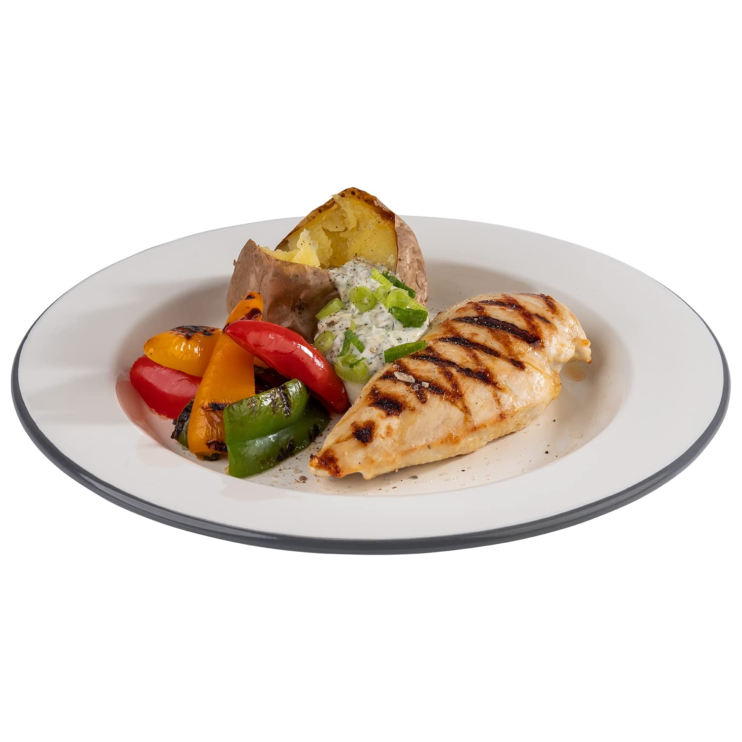 Diese Teller aus ofenfestem, 3-fach emailliertem Metall sind perfekt für die Mitnahme beim Picknick oder Camping geeignet, können aber ebenso zu Hause genutzt werden. Es können kalte Speisen wie Salat als auch warme Gerichte auf den Tellern angerichtet werden. Die Teller sind schnitt- sowie kratzfest und zudem noch spülmaschinengeeignet. Der graue Rand gibt den Tellern den typischen Look. Durch die Bruchsicherheit sind sie perfekt zum Transport geeignet. Maße (ØxH): 26x2 cm. Liefermenge: 2er Set.