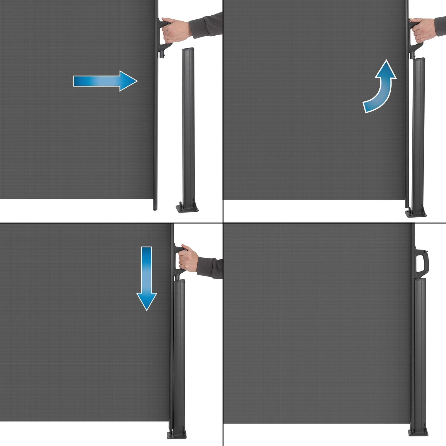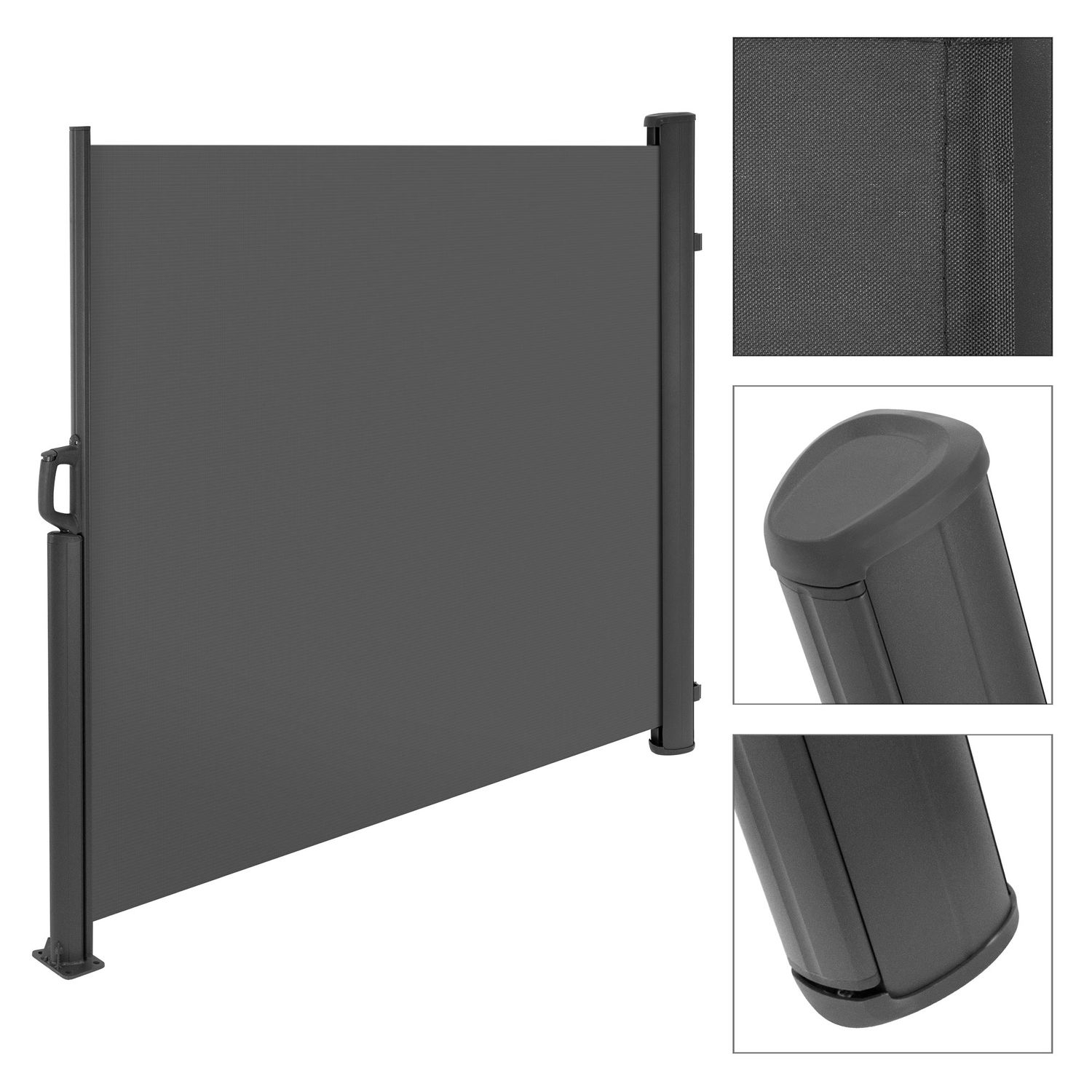 Schützen Sie Terrasse, Balkon oder Garten stilvoll vor Wind und neugierigen Blicken: Die AMBIANCE Seitenmarkise überzeugt mit robuster Aluminium-Kassette in Anthrazit, wasserabweisendem Polyester-Tuch in Dunkelgrau sowie einem komfortablen Federmechanismus für das automatische Aufrollen.