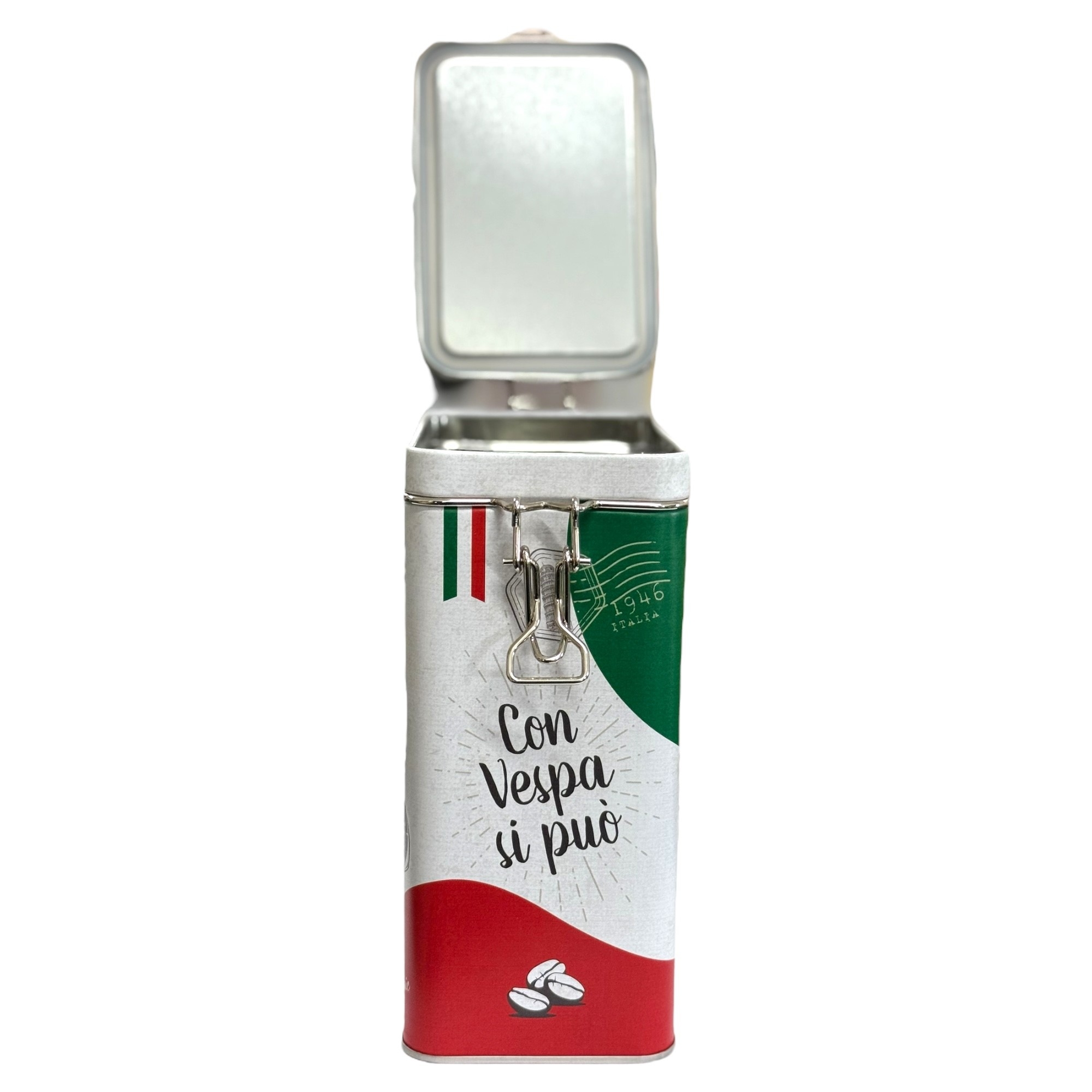 Gefertigt aus robustem, matt beschichtetem Metall, ist diese Dose nicht nur langlebig, sondern auch ein optisches Highlight. Die Vespa-lizenzierte Gestaltung und die detallierte Prägung auf dem Deckel und den Seiten machen die Dose zu einem echten Blickfang. Die Dose hat ein Fassungsvermögen von 1,3 Litern, was sie perfekt für die Aufbewahrung von etwa einem Pfund Kaffee oder Tee macht.