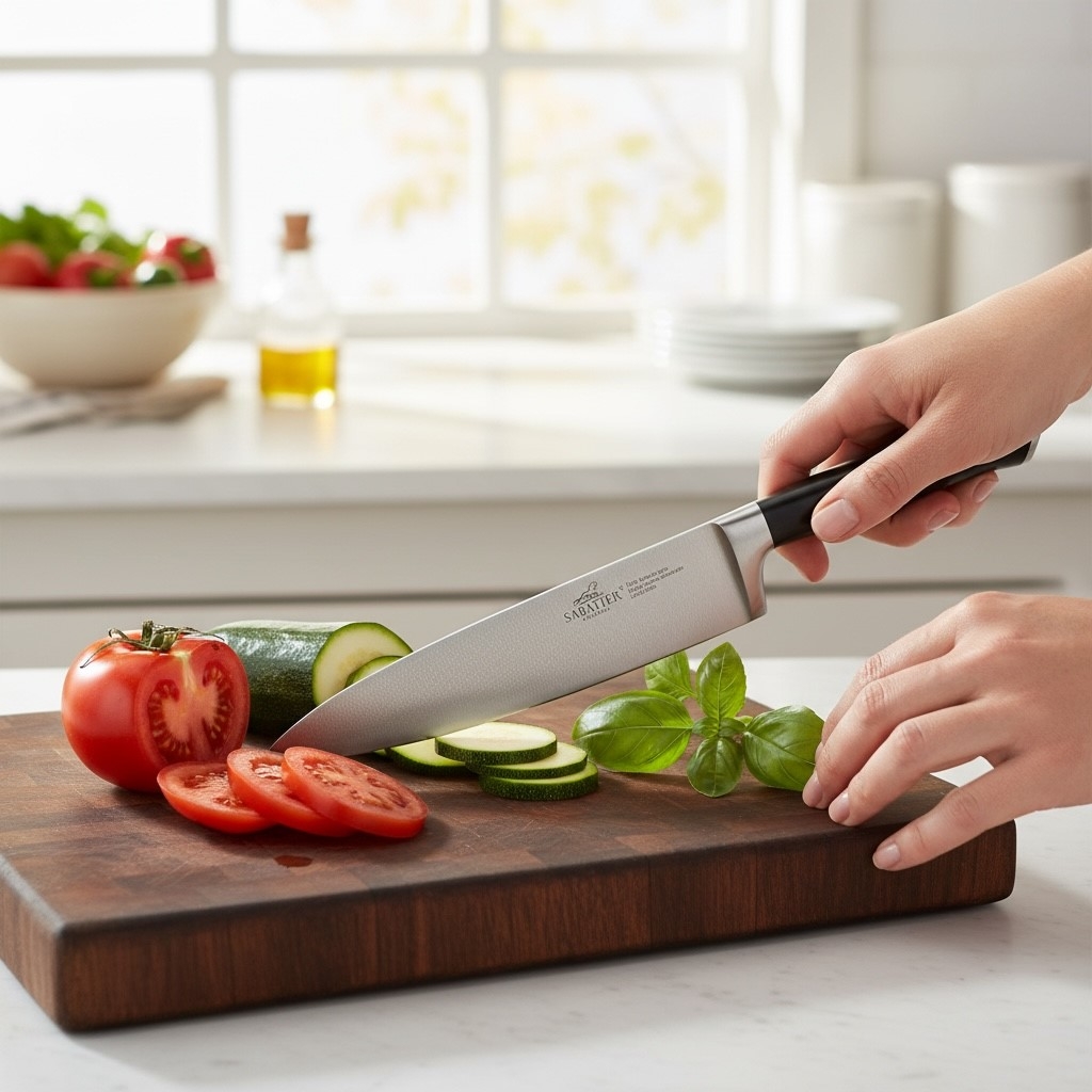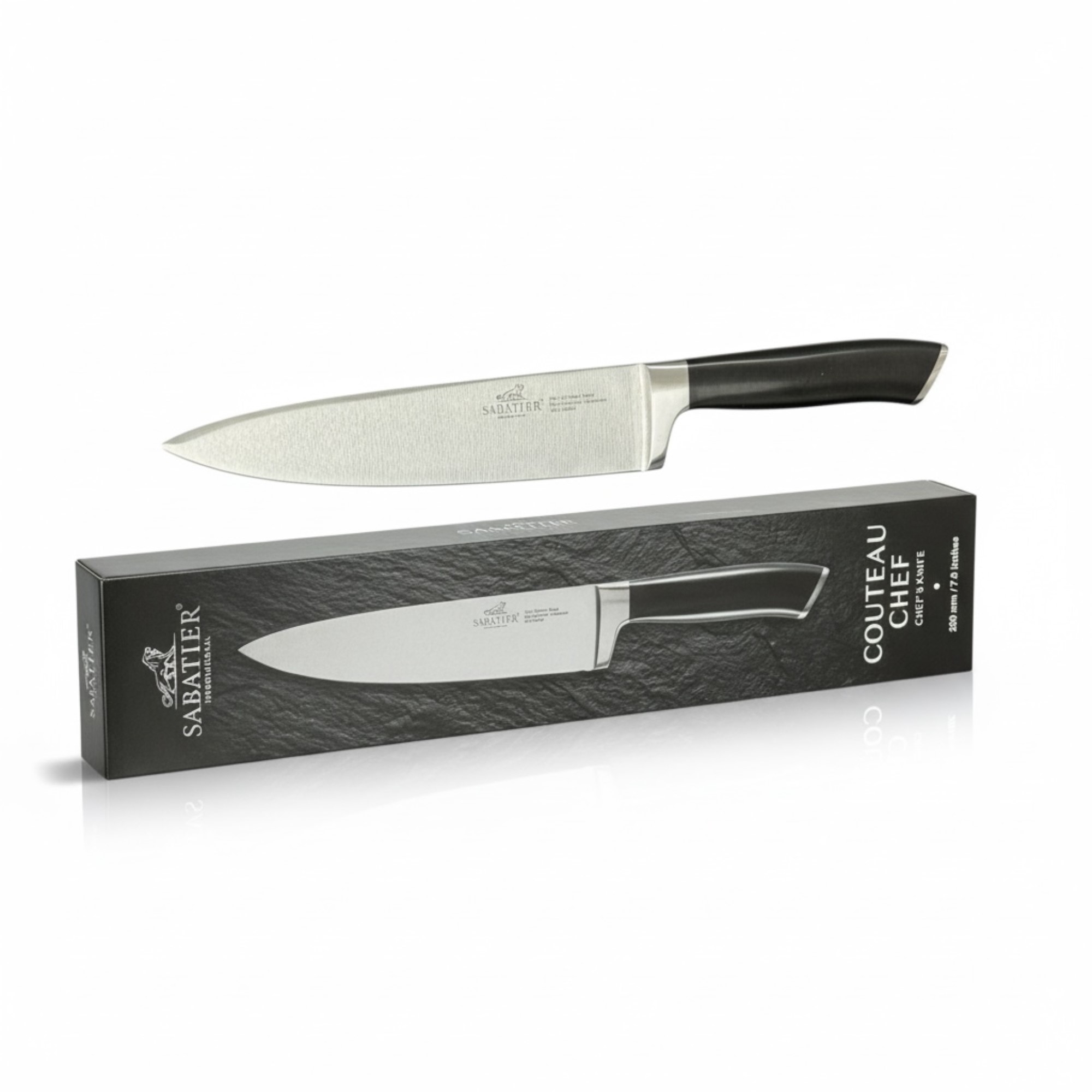 Erleben Sie das Sabatier Chefmesser – ein Meisterstück für Ihre Küche. Die hochwertige 20 cm Edelstahlklinge sorgt für kompromisslose Schärfe, während der ergonomische, schwarze Griff sicheren Halt und Komfort garantiert. Ob Profi- oder Hobbykoch: mit diesem Messer gelingt das präzise Schneiden, Hacken und Filetieren von Gemüse, Fleisch und Fisch mühelos. Setzen Sie auf Zuverlässigkeit, Langlebigkeit und Eleganz mit Sabatier!