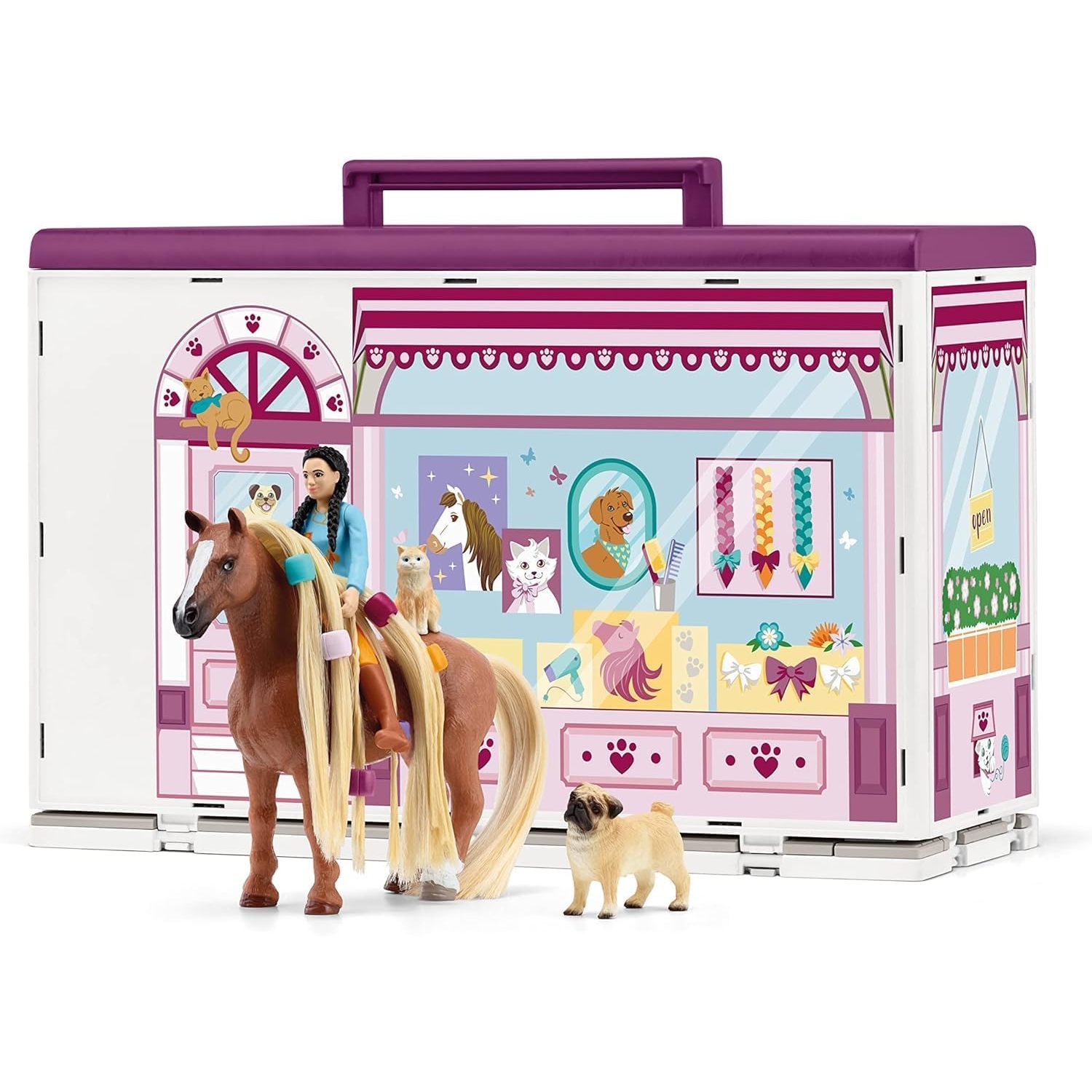 Im Schönheitssalon erhalten die Haustiere eine echte Wellnessbehandlung. Während Hund und Katze noch im Wartezimmer sitzen, wird dem Pferd schon mit echtem Wasser das Fell gewaschen. Gründlich werden hier ältere Stylings entfernt, damit alles bereit ist für den neuen Look. Im Frisiersalon geht es dann richtig zur Sache. Mit der Bürste wird die kämmbare Mähne bearbeitet und geflochten. Die schöne Frisur kann man dann nach Lust und Laune mit Haarclips verzieren. Doch damit nicht genug: Vielleicht soll das Fell selbst auch noch gestaltet werden? Mit der extra dafür hergestellten Farbe können fantasievolle Muster aufs Fell gemalt werden. Beim nächsten Besuch werden die einfach abgewaschen und es ist Platz für Neues!