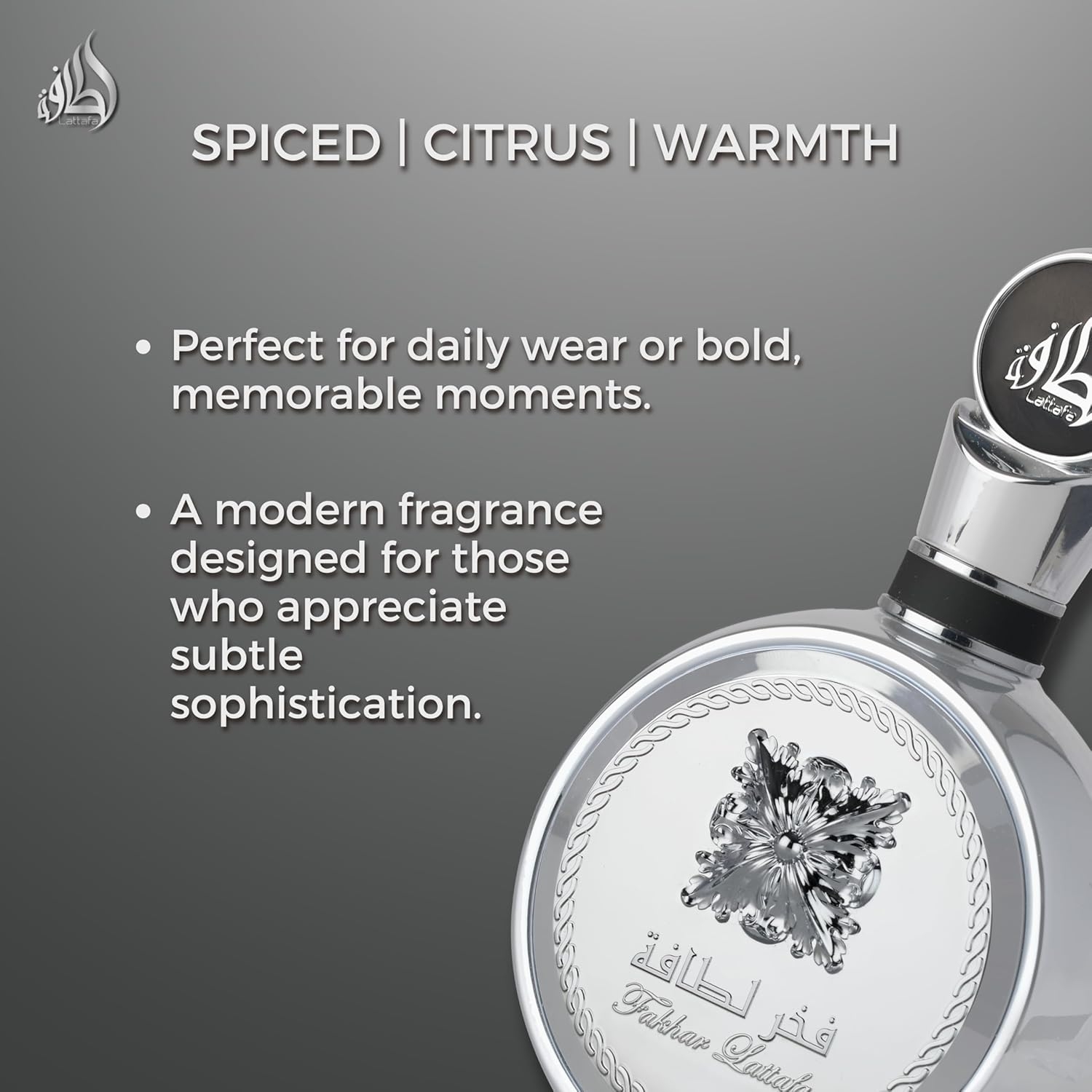Lattafa Fakhar Platin ist ein moderner, aromatisch-fougère Duft mit würzig-frischer Eröffnung und tiefem, holzig-rauchigem Ausklang. Das Unisex Eau de Parfum verbindet Klarheit und Charakter – ideal für alle, die elegante Präsenz ohne Aufdringlichkeit schätzen.