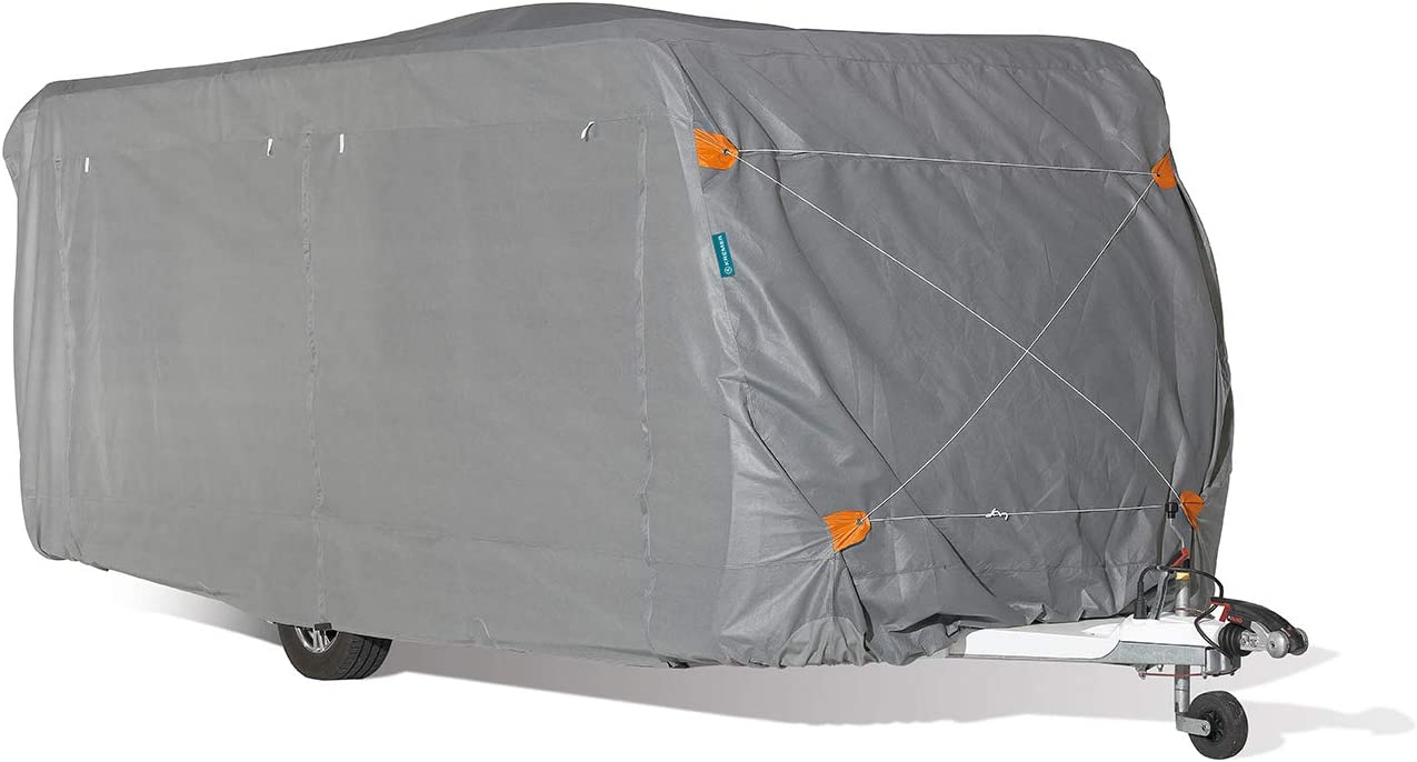 Vierlagiges Gewebe an der Oberseite mit ultraschallverschweißten Nähten Dreilagiges Gewebe an den Seitenflächen und verdeckte Reißverschlüsse Türseite mit 3 verschiedenen Öffnungsmöglichkeiten für einen komfortablen Zugang zum Wohnwagen PU-verstärkte Ecken für lange Haltbarkeit 4 Sturmbänder mit praktischem Clip-Verschluss Elastischer Saum und widerstandsfähige Laschen mit Verzurrösen ermöglichen eine universelle Passform Inkl. Kordel und Aufbewahrungstasche Korpusmaß (ohne Räder und Deichsel): B 670 x H 250 x T 220 cm