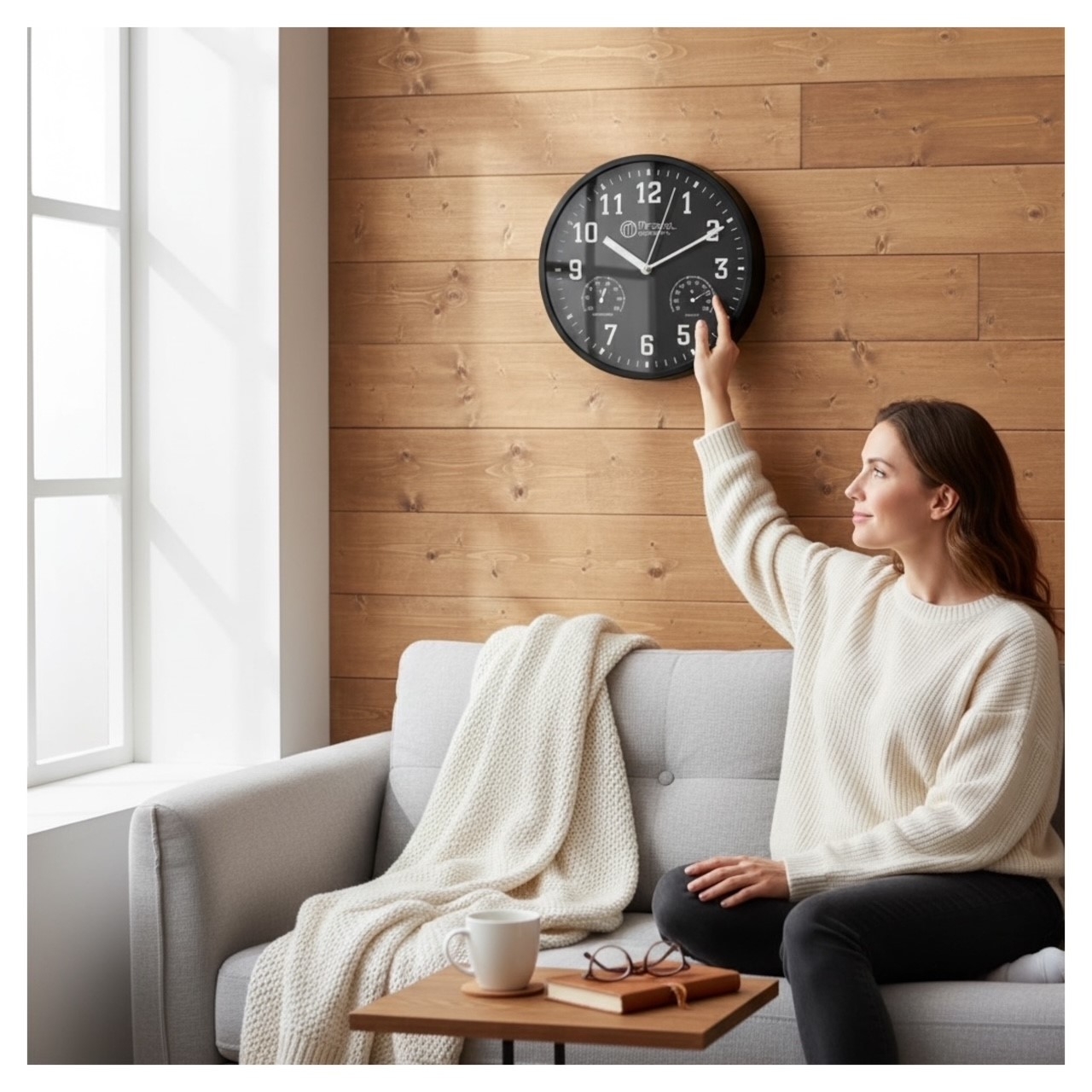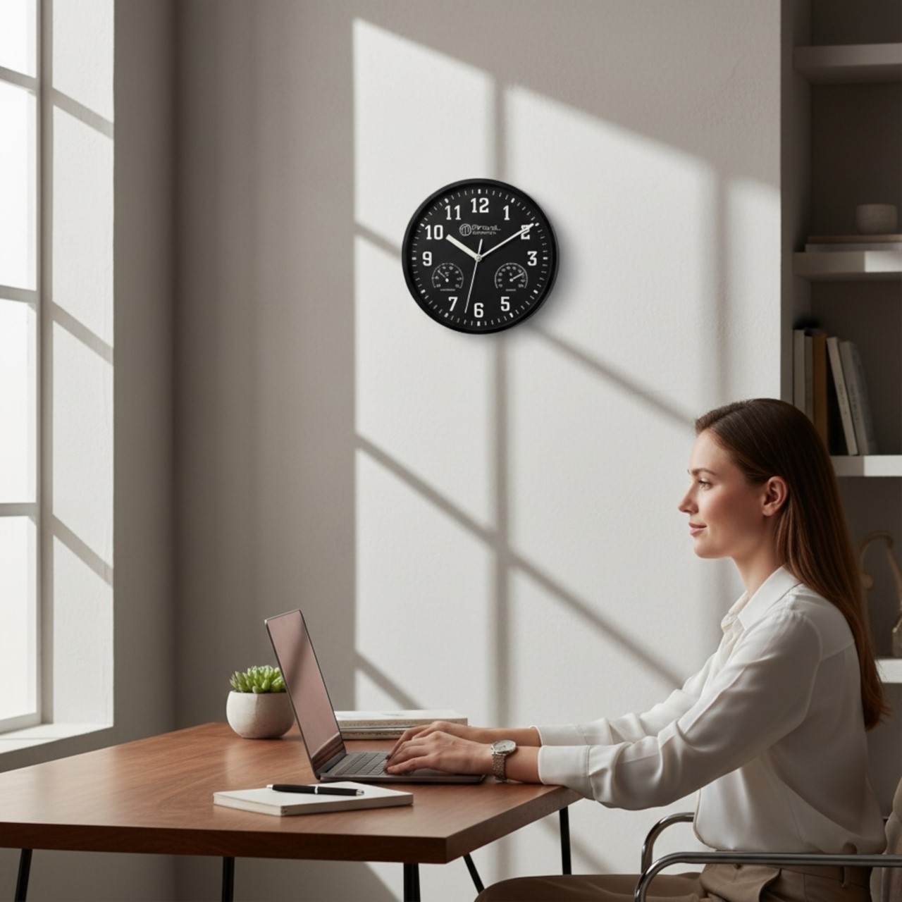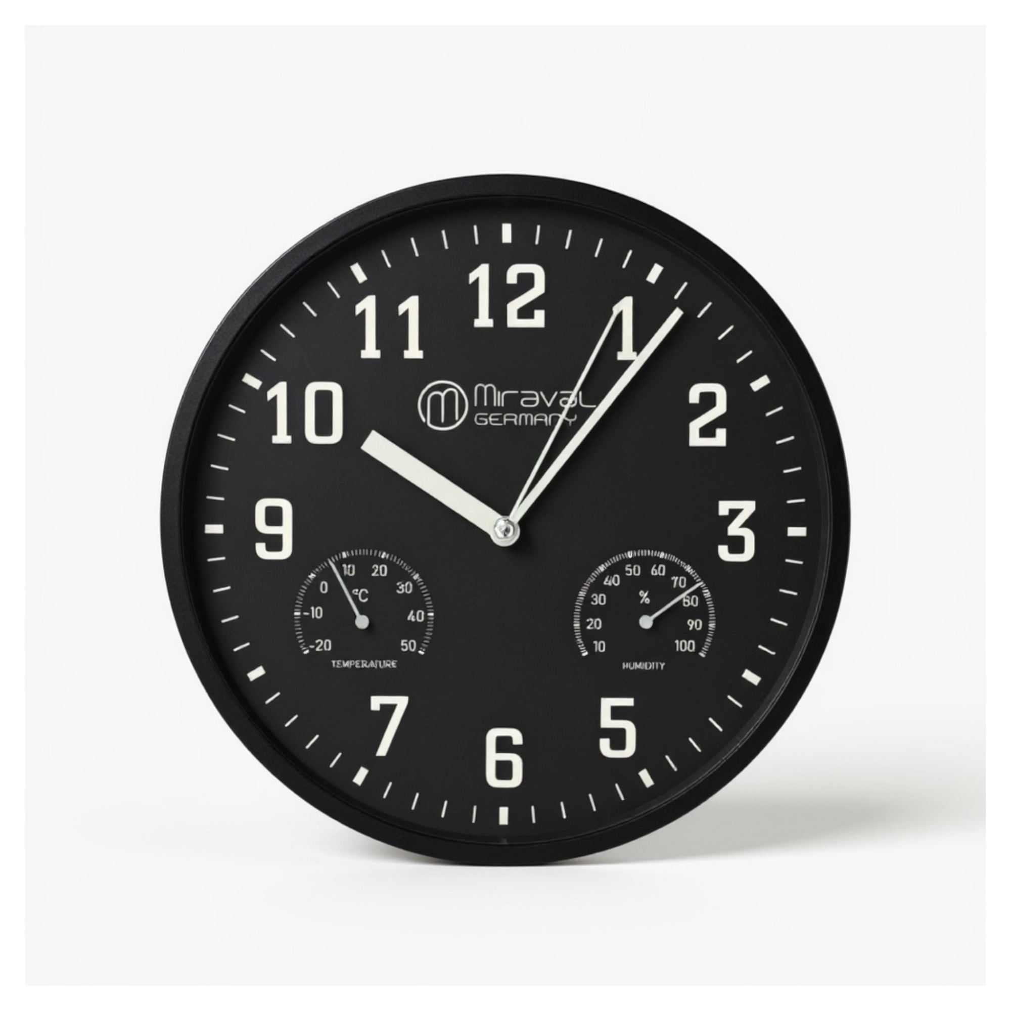 Die elegante Miraval Wanduhr in Schwarz verbindet zeitloses Design mit praktischen Zusatzfunktionen. Mit einem Durchmesser von Ø 25 cm, einem klaren Zifferblatt in Weiß und einem geräuschlosen japanischen Quarzwerk passt sie perfekt in Wohnzimmer, Büro, Küche, Flur oder Schlafzimmer.